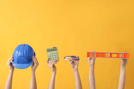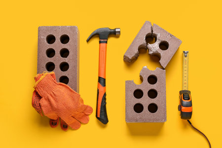 Set of tools for constructor work, build, paint and repair house on yellow background top view copyspace