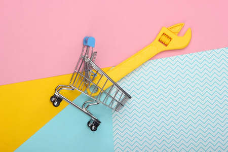 Mini shopping trolley with a toy wrench on a colored pastel background. Top view. Minimalism