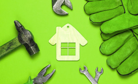 Repair or home improvement tools and a house model on a plain background. Background for your design