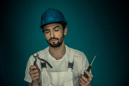 Attractive bearded young workman standing eyeing his tools holding up a pair pf pliers and a screwdriver as he decides which is best to use