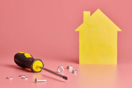 Home repair and redecorated concept. House renovation. Screws and yellow house shaped figure on pink background.