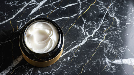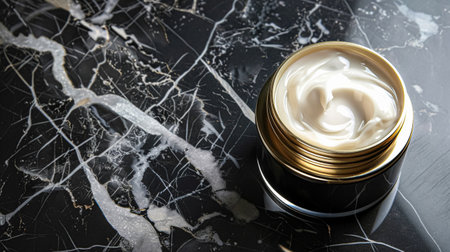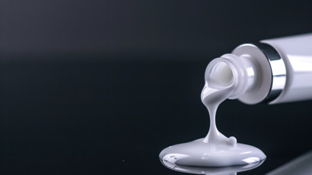 This close-up image showcases a tube of skin care product with a creamy texture, elegantly dripping onto a reflective black surface, emphasizing purity and quality.