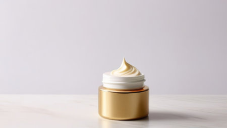 A golden jar with a white creamy substance stands against a purple gradient background, placed on a marble surface with natural light.