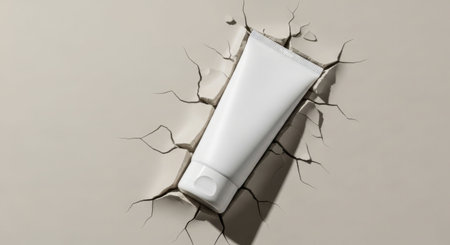 Blank white cosmetic tube mockup emerging from cracked neutral background with space for design. Product presentation concept.