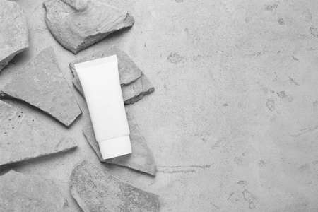 Flat lay composition with tube of hand cream and stones on gray background. Mockup for design