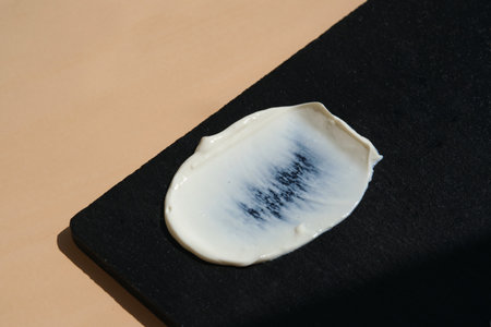 White cosmetic cream on a black stone on a beige background.