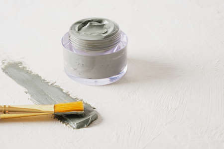 a brush for applying face masks, a jar of cosmetic blue clay and a smear of clay on a textured light background copy space top view