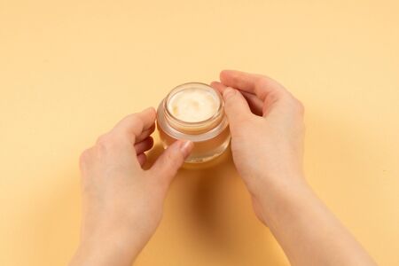 Female hands holding cream jar, skin care and beauty product concept.
