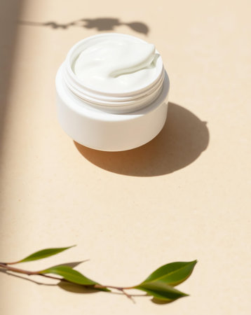 A white cosmetic cream jar sits on a light beige surface, with a sprig of leaves and a shadow.