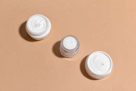 open jar of cream without a lid top view on a light background, cosmetic background with copy space with one single skin care product, flat lay cosmetology industry object