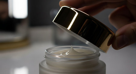 Close up of female hand putting cream on jar of skin care cream