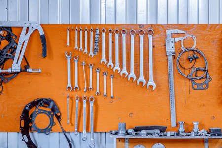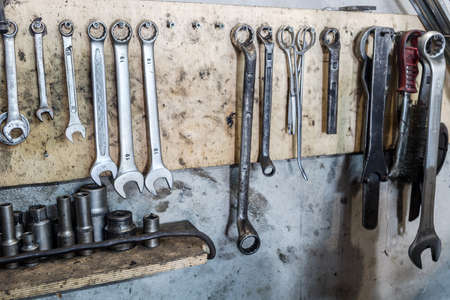 A set of tools in the real auto repair shop. The organization of the workplace at the mechanic.