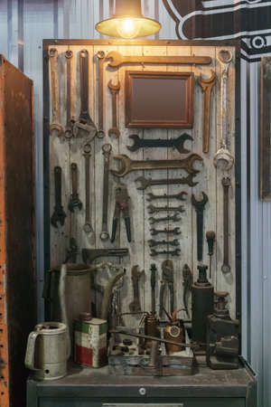 Workshop scene. Tools hanging on the wall in the workshop, garage vintage style