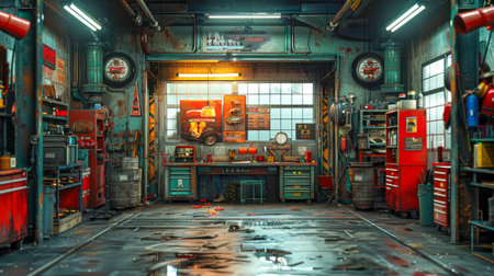Mechanics focus on repairing vehicles in a lively auto shop filled with a variety of tools and equipment, reflecting a rustic charm and industrial atmosphere.