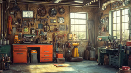 Bright and organized vintage workshop showcasing a variety of tools, equipment, and materials, creating an inviting space for craftsmanship and creativity.