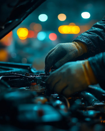 Gloved hands working on car engine at night, city lights bokeh in background