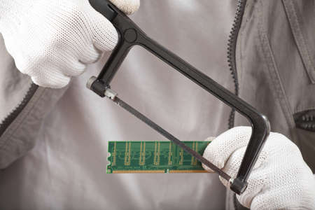 Hand of computer engineer with screwdriver and hardware elements. A close up of the hands taking lives and some hardware elements like ram memory, cpu