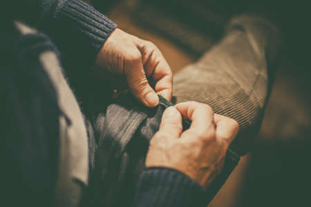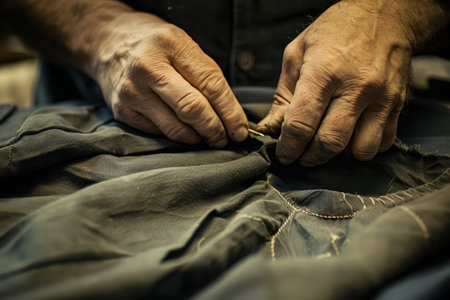 unrecognizable professional seamstress, hand tailoring, sews fabric by hand.