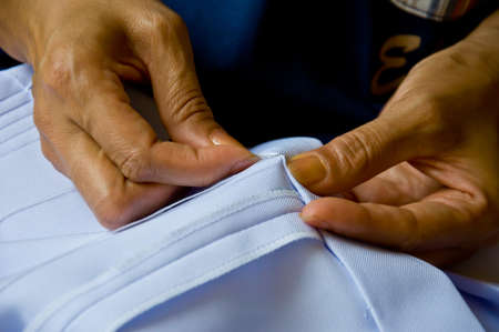 Concept of using clothes by repair, to have a long useful life and beautiful by woman's hand.