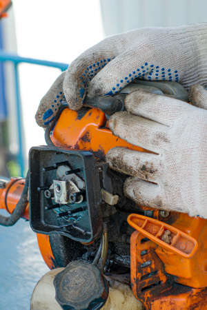 the master in working gloves repairs the engine of the old gas trimmer removes the tip of the high-voltage wire from the spark plug