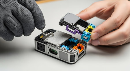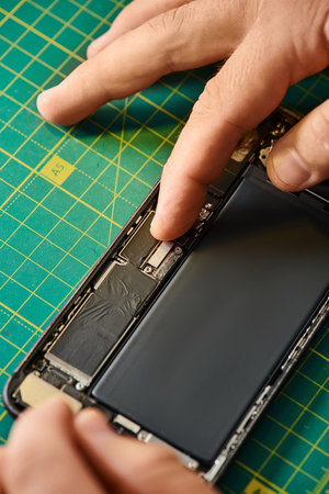 partial view of technician assembling mobile phone after reparation in workshop, small business