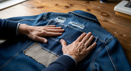 A person's hands touching the back of a blue denim jacket, inspecting the distressed texture and fabric details on a wooden work table. This conveys concepts of fashion design, quality control, or appreciation of clothing material.