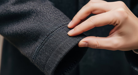 Close-up of female hand adjusting dark gray coat sleeve fabric