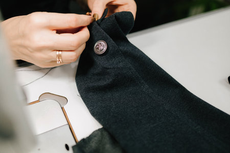 A woman dressmaker sews a black corduroy jacket on a mannequin in her atelier, close up