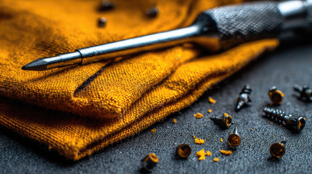 Vibrant close-up of a screwdriver resting on an orange cloth, surrounded by scattered metal screws. Perfect imagery for DIY enthusiasts and repair content.
