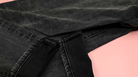 Jeans of different colors are scattered on a pink background. Grey, black, light, white jeans are on the table. background with jeans
