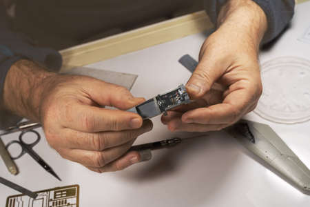 Close up human hands holding plastic part of aircraft with many tiny details, assembled and painted by hand. Special equipment for avia modeling hobby on white table background. Copy space.