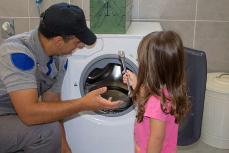Picture of a handyman dad repairing a broken washing machine with his daughter helping him with tools