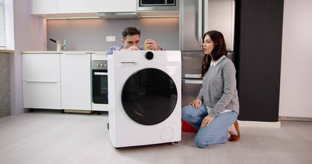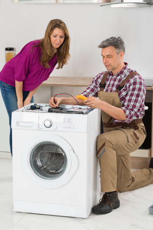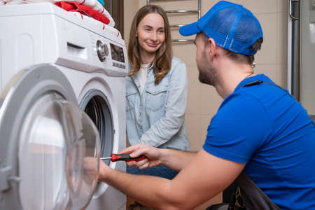 Repairman checking a broken washer, the customer is standing next to him, repair service concept