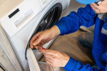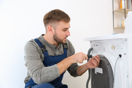 Repairman in uniform fixing broken washing machine with screwdriver at home