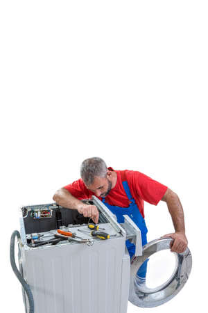 Plumber. handyman repairing washing machine on white