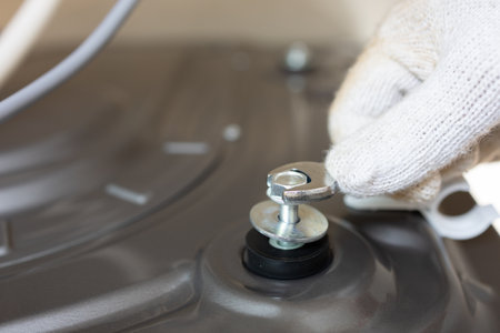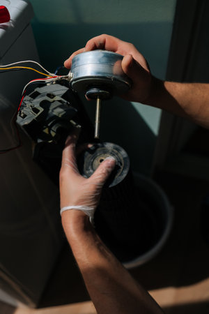 Close-up vertical shot of unrecognizable technician wearing safety gloves examines components of disassembled washing machine, focusing on detached motor while troubleshooting malfunction.