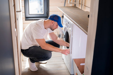 working man plumber repairs a washing machine in laundry