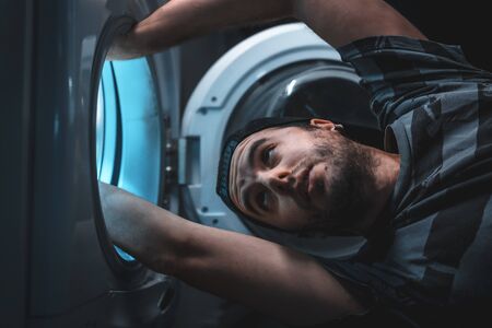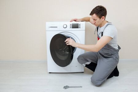 Young repairman checks a broken washing machine on the floor in a room close-up.