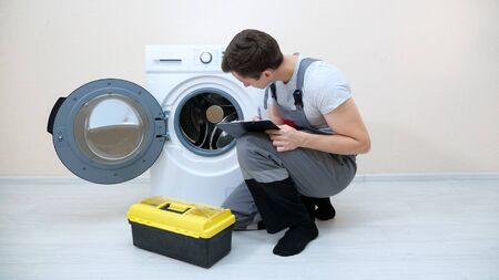 skilled repairman writes on clipboard checking broken washing machine on floor in room closeup