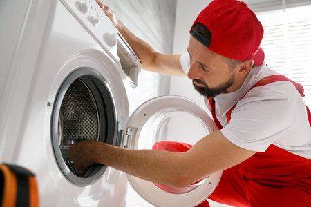 Repairman in uniform fixing broken washing machine at home