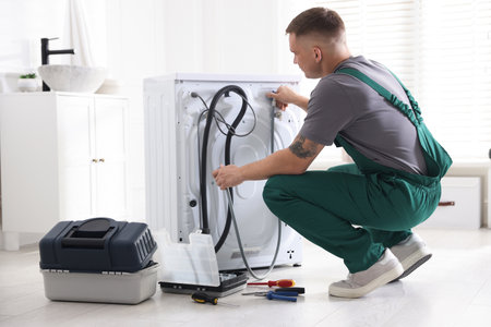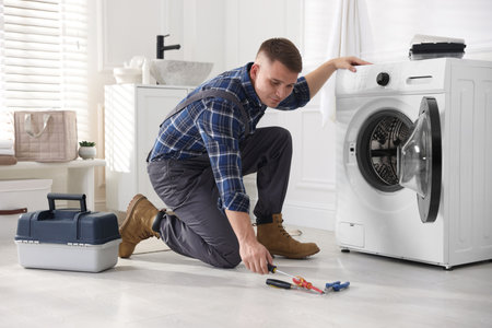 Repairman in uniform fixing broken washing machine with screwdriver and toolbox at home