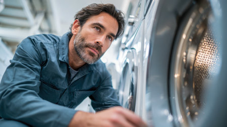 A technician in uniform carefully examines a sleek washing machine, demonstrating expertise and dedication amid a contemporary retail or service environment.
