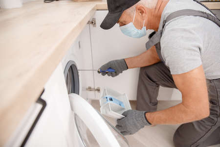 Working man in medical mask plumber repairs fix washing machine in kitchen. Concept service technician