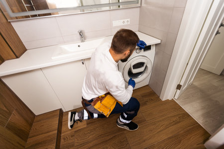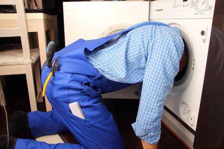 Repairman fixing broken washing machine at home