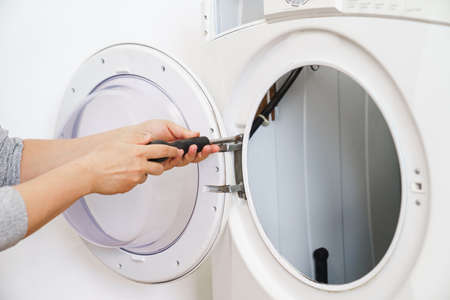 Repair and maintenance of the washing machine. Screwdriver in the hand of a master on the background of a washing machine.