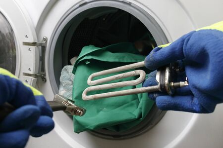 Repair of washing machines. Hand of a repairman with a turbulent electric heater covered with a coating of hard water. Replacing the electric heater in the washing machine