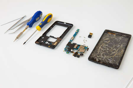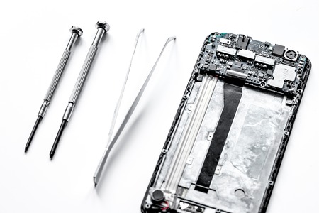 concept repair smartphone with parts of digital gadgets with tools on white background close up