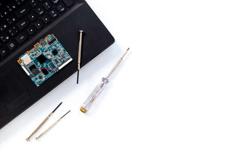 Laptop disassembling parts and devices on white background, laptop repair