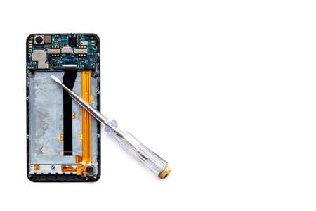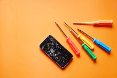 Smart phone broken and cracked screwdriver and tweezers prepairing to repair on white background