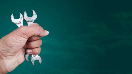 A worker is holding wrench in his hand tightly, old rusty wrenches / workers day or labors day, it is also called labours day sometimes